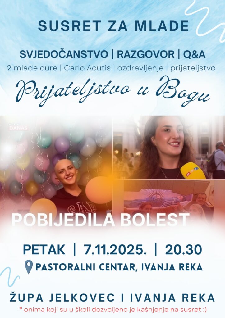 Pozivamo sve mlade na susret za mlade u petak, 7.11.2025. u 20.30 sa temom: Prijateljstvo u Bogu gdje će 2 mlade djevojke posvjedočiti o svojim životima i njihovom prijateljstvu u Bogu, te kako ih je Carlo Acutis spojio. Obje imaju jako lijepa, različita, al duboka svjedočanstva koja su se u jednom dijelu njihova života ispreplela.